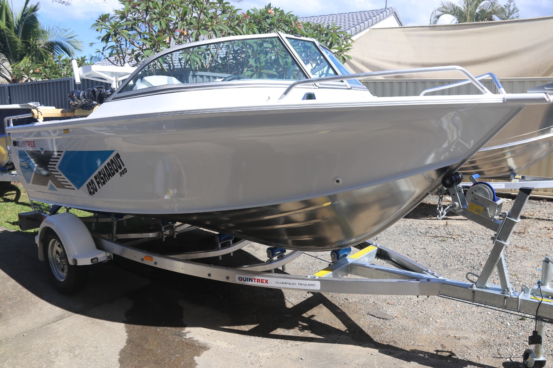 Boat in Stock, Motor on order and coming! New boat has Blue Stripes, the other images for illustration purpose as to how it will look once rigged!The new Fishabout Features the current blade hull with a new and improved flared bow. The stretch-formed aluminium side sheets have more curve that will run further down the length of the boat to deflect more spray away from passengers