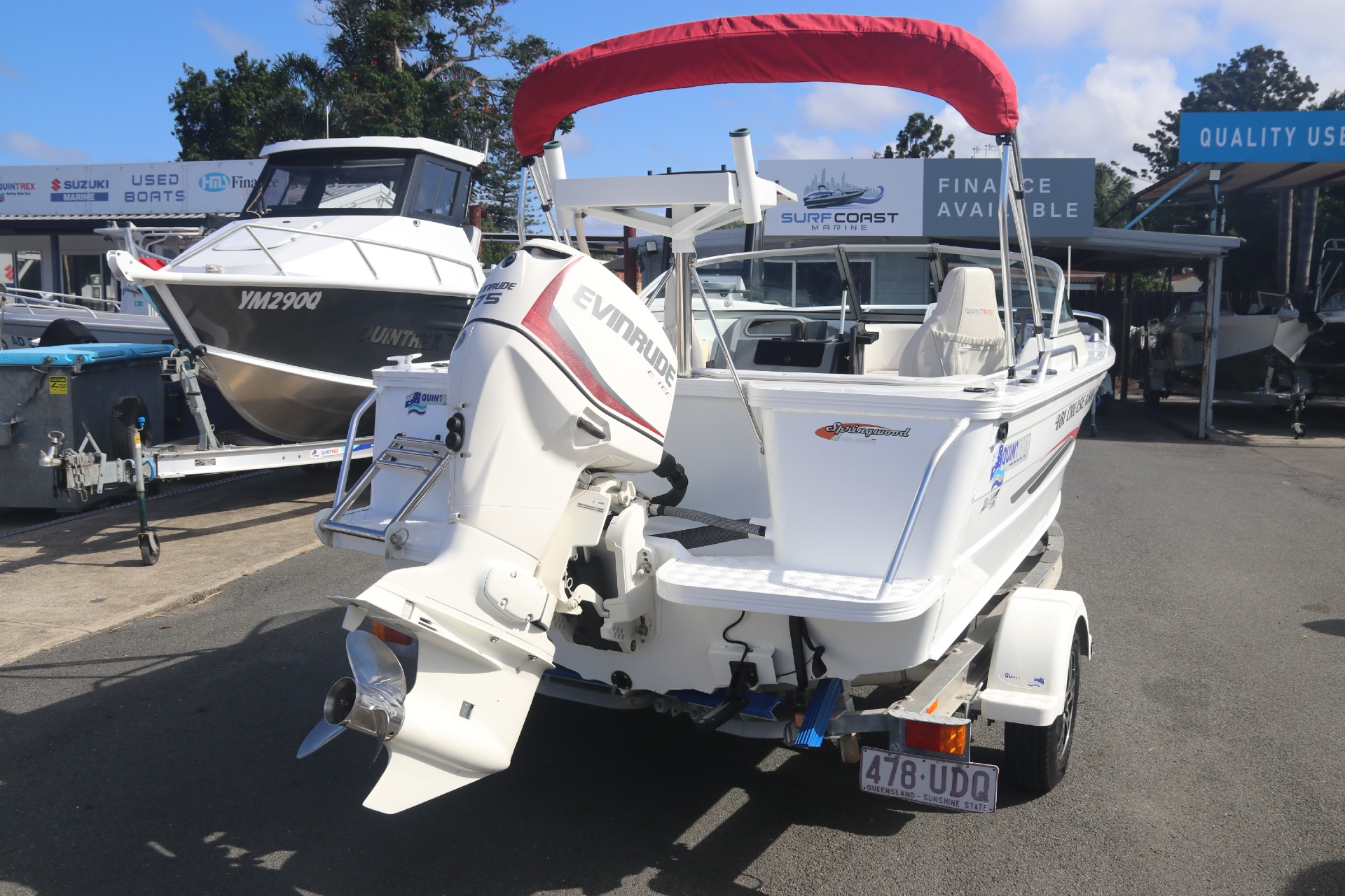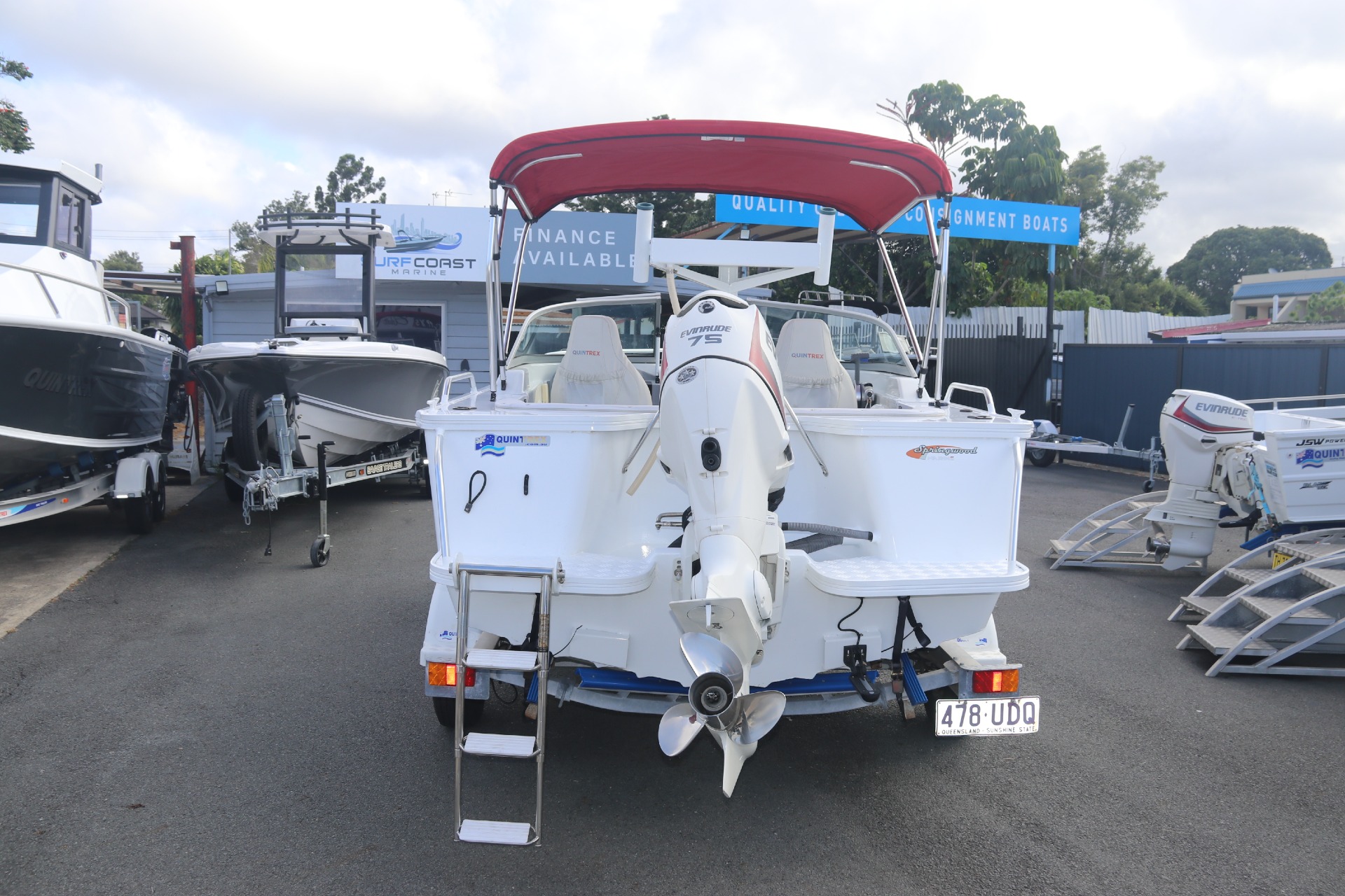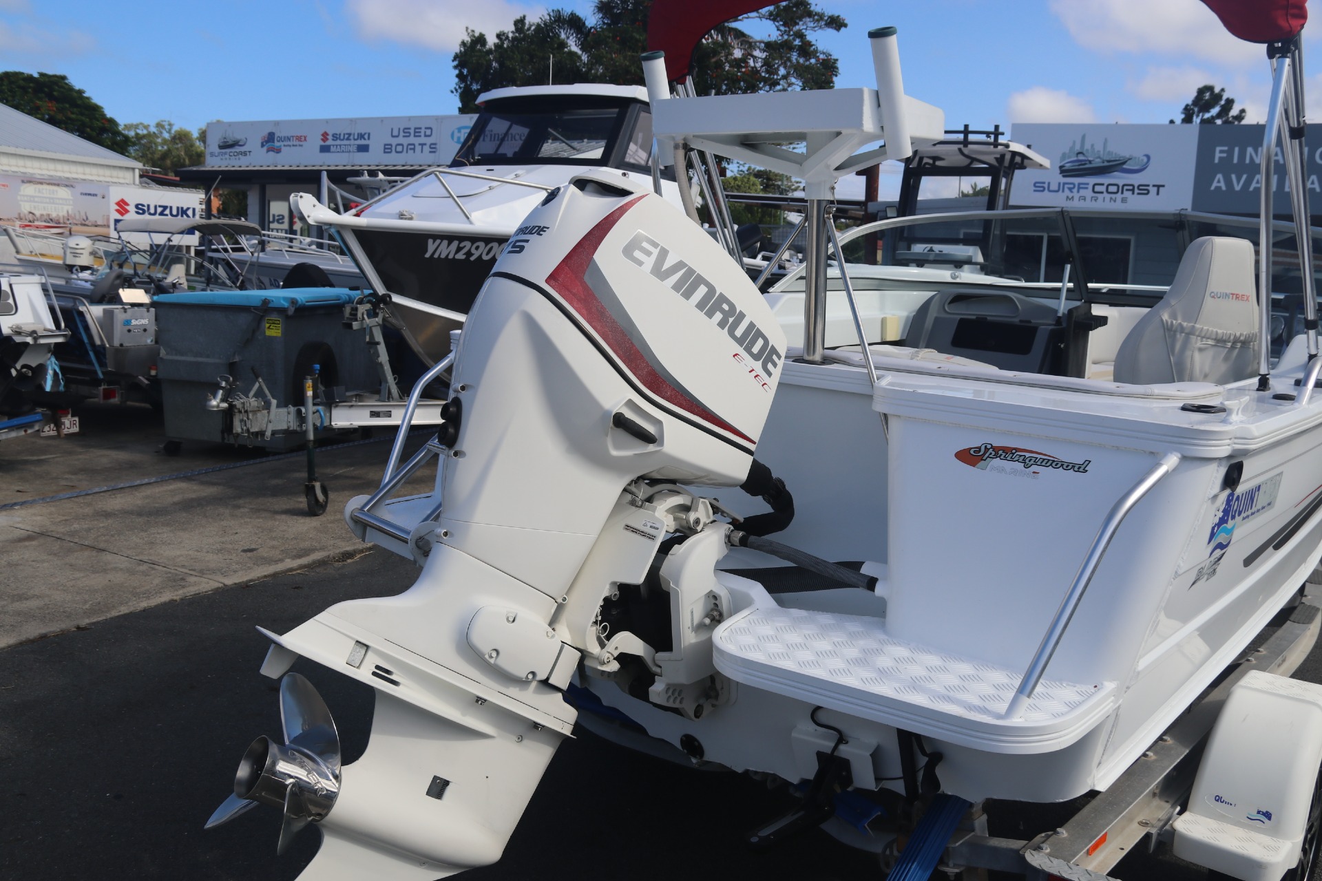 EVINRUDE E-TEC 75HP WITH STAINLESS STEEL PROPELLOR (180 hours)QUINTREX DRIVE ON 1100KG ALUMINIUM BRAKED TRAILER