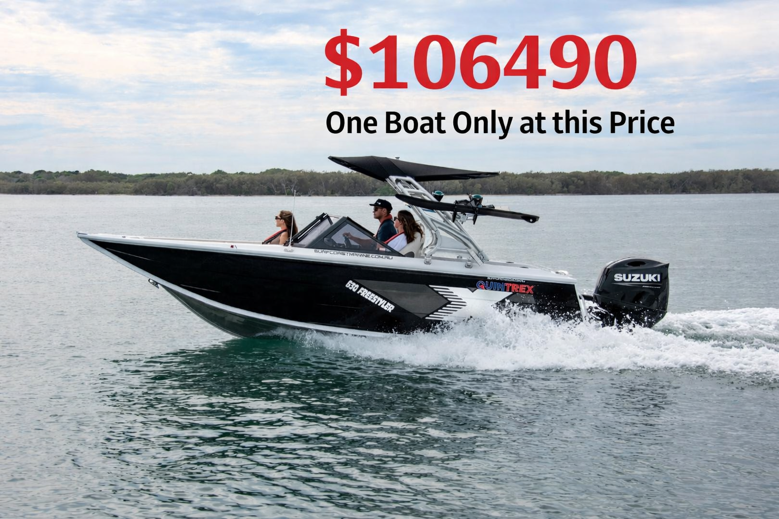 In Stock and available now at a Deal thanks to Surf Coast Marine Summer Promotion - Saving over $14000! The Apex hull design provides the ultimate on water performance, smoother riding in rough water and even better stability and grip when cornering, The forked bow design increases floor space along with the raised side decks (RSD) increasing freeboard by 80mm and overall volume by 20%. The revolutionary hull design allows you to reach full boating potential offering unsurpassed versatility and performance. The 630 Freestyler is perfect for the whole family offering safety and plenty of storage. The new console storage hatch position allows for easy access and a place to keep valuables close by. 2025 QUINTREX 630 FREESTYLER DRIVE AWAY PACKAGE INCLUDES- SUZUKI DF200APX 4 STROKE 2867CC IN LINE 4 CYLINDER WITH STAINLESS PROPELLOR SUZUKI PRECISION CONTROL (SPC) - DRIVE BY WIRE TECHNOLOGY HYDRAULIC STEERING & CONCEALED SIDE MOUNT - DIGITAL SUZUKI DIGITAL MULTI FUNCTION GAUGE QUINTREX T ALLUMINIUM 2000KG ATM TANDEM DRIVE ON BRAKED TRAILER ADDITIONAL OPTIONS INCLUDED ON THIS PACKAGE PAINT TWO TONED (BLACK) PORT AND STARBOARD SIDE WINGS ROSWELL CAM RT WAKE TOWER WITH CUSTOM SUN TOP ROSWELL KNEEBOARD/WAKE RACKS AND SWIVEL BUNK INFILL AND CUSHION ADDITIONAL FUSION SPEAKERS IN BOW COCKPIT TABLE 12V SOCKET & USB CHARGING DUAL BATTERIES SPARE WHEEL & CARRIER, CATCH AND RELEASE STANDARD FACTORY INCLUSIONS APEX HULL DESIGN 80MM RAISED SIDE DECKS BOW SPRIT & BOW ROLLER FRONT DECK & TRANSOM CLEATS CONVERTIBLE CASTING DECK UNDER BOW LOUNGE CUSHIONS ROTO MOULDED STORAGE CAPACITY UP FRONT FREE STANDING BLACK WINDSCREEN CONSOLE STORAGE HATCH POSITIONS APEX SPORT ADJUSTABLE BUCKET SEATS WITH SLIDERS UNDERFLOOR STORAGE TO PACK AWAY ALL YOUR GEAR MOULDED SIDE PANELS & COCKPIT LIGHTS PREMIUM HOOKLESS CARPET POLE MOUNT INSERT AT STERN SELF DRAINING FLOORS / NON RETURN SCUPPERS TRANSOM DOOR 120 LITRE UNDERFLOOR FUEL TANK NAV LIGHTS/ BILGE PUMP/ BATTERY SWITCH/ SWITCH PANEL 5MM BOTTOM SHEET, TRANSOM & 3MM SIDE SHEETS TRANSDUCER BRACKETS * 2 7 PERSON CAPACITY QLD OR NSW REGISTRATIONS SAFETY GEAR INCLUDING FIRE EXTINGUISHER Please call our huge Gold Coast Dealership to discuss this package further, right near the Broadwater and Harbourtown. We can organise your finance and insurance and have you on the water sooner than you think Call today for a quote!