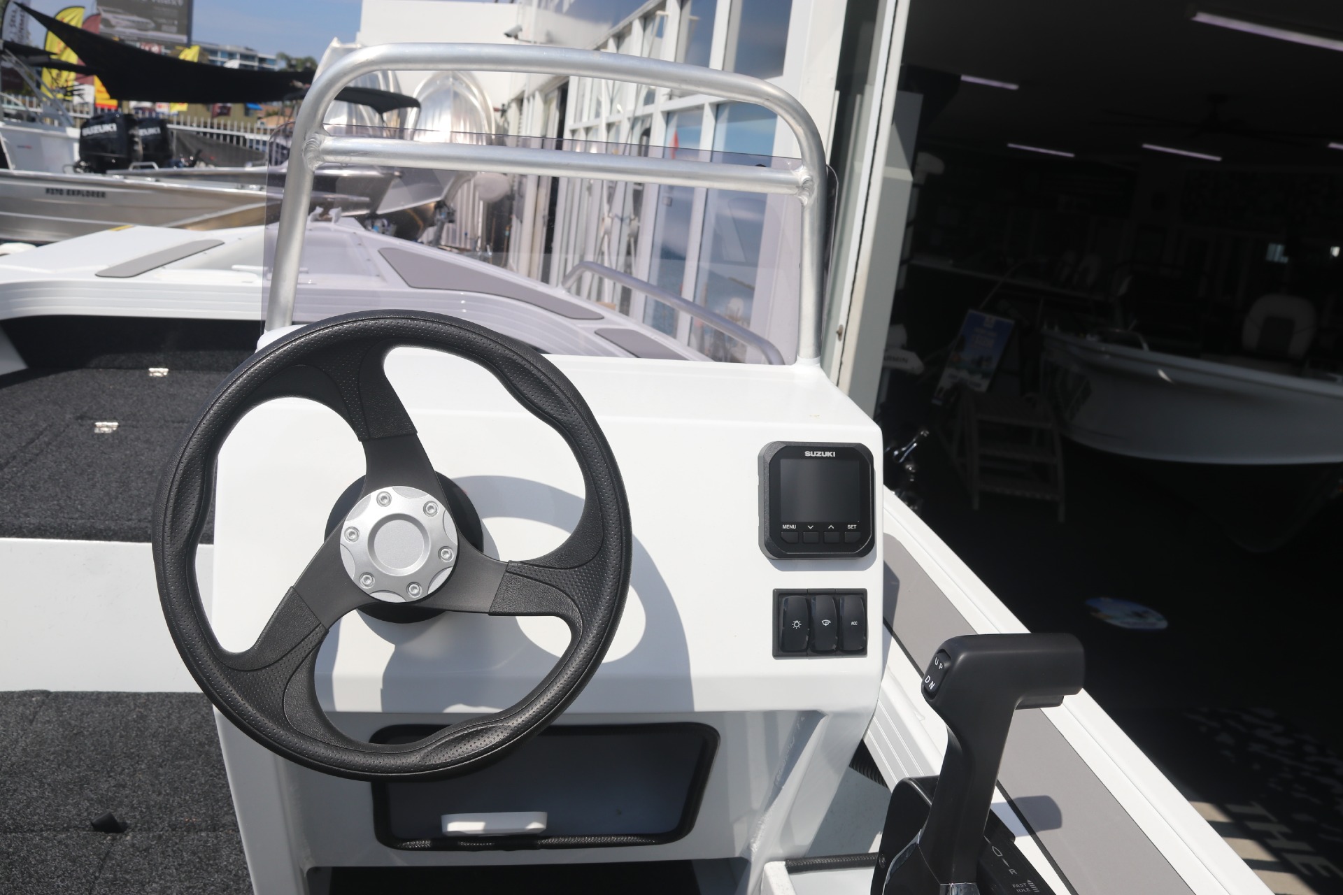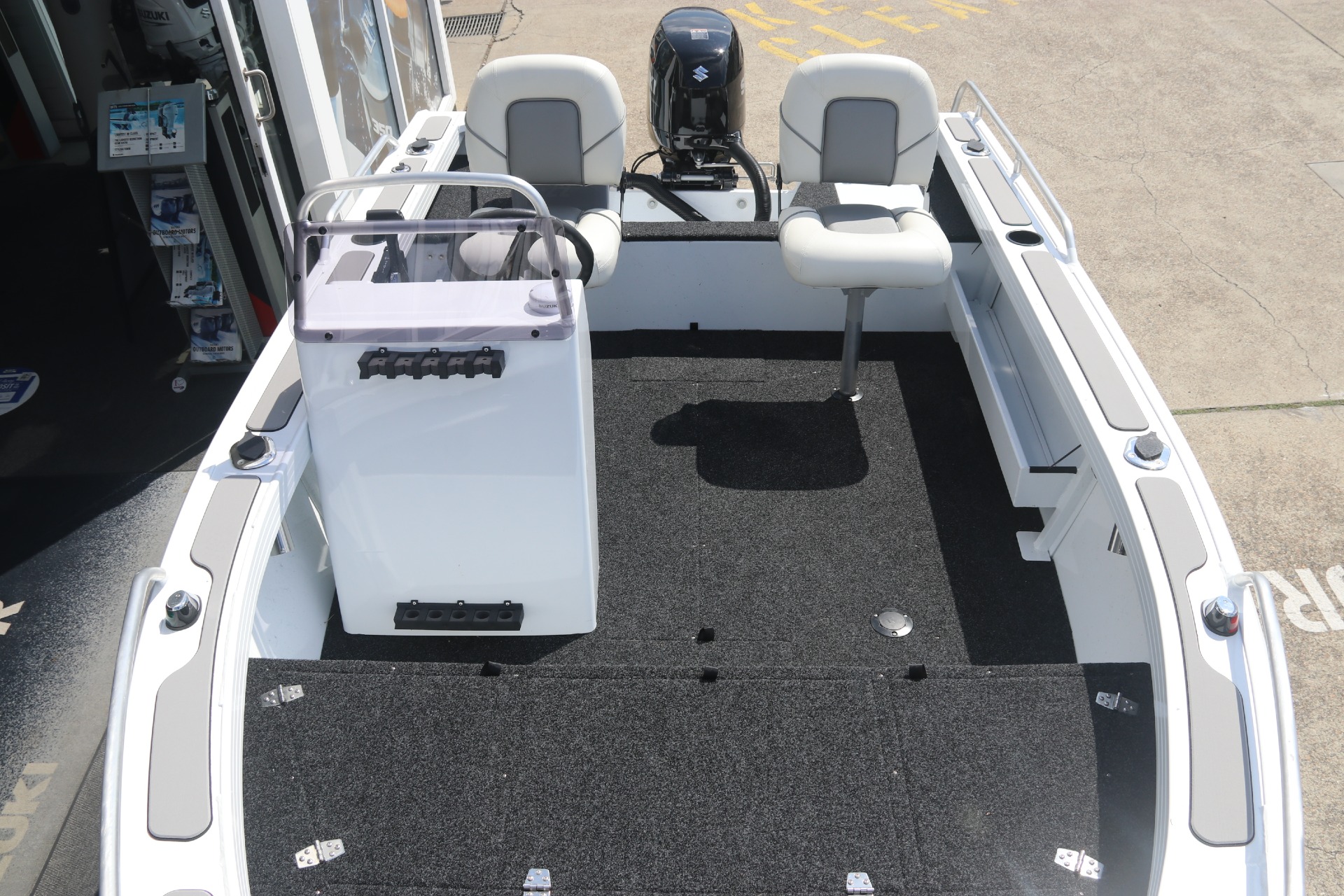 - NEW SIDE CONSOLE WITH SCREEN & GRABRAIL, GAUGES, SWITCHES, UNDER HELM STORAGE SHELF DRINK HOLDERS & LARGER AREA TO MOUNT BIG SOUNDERS