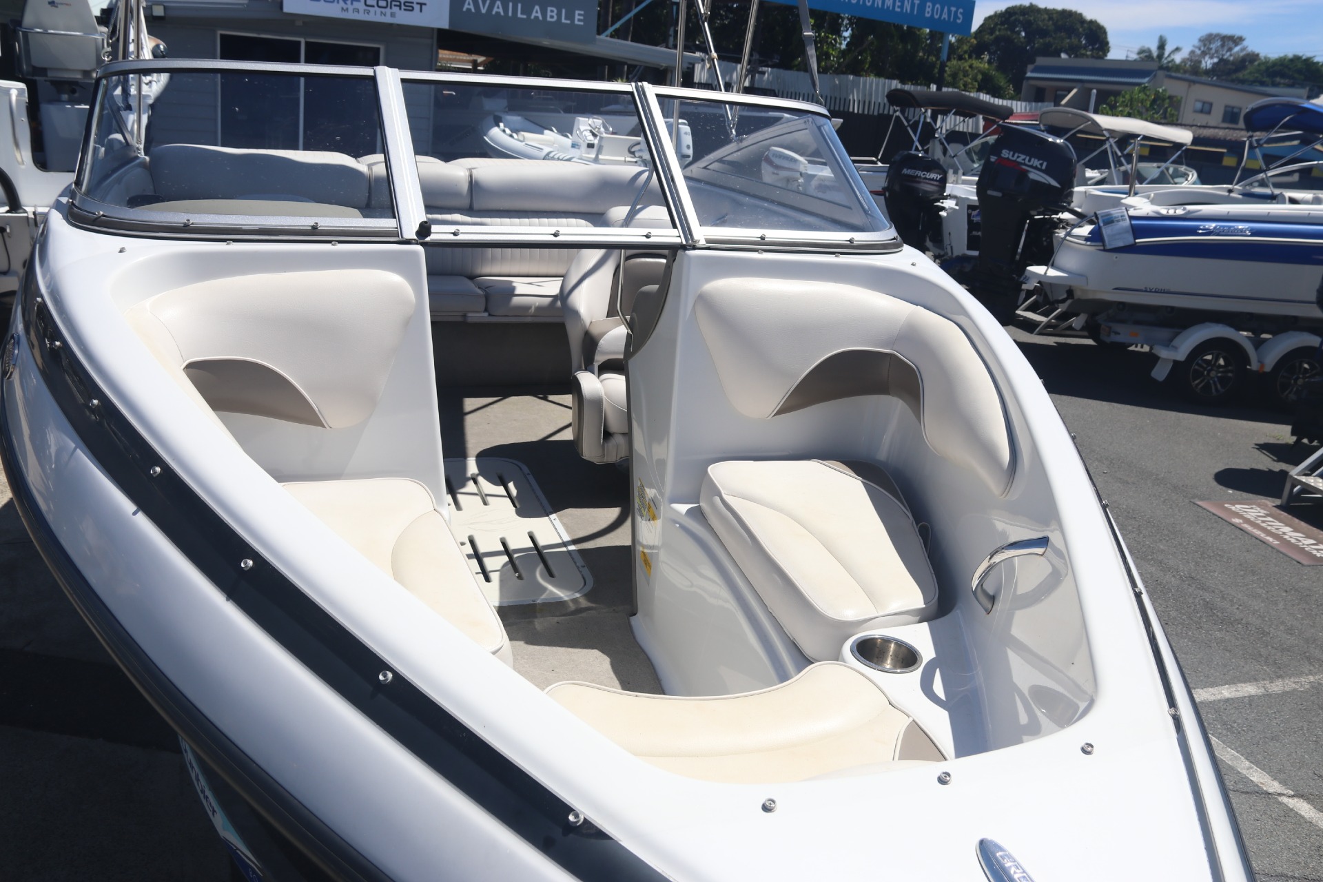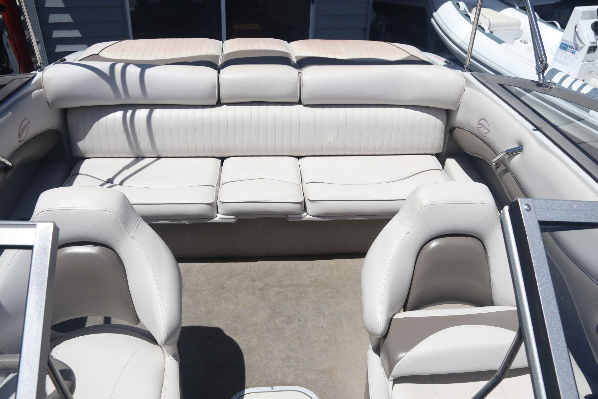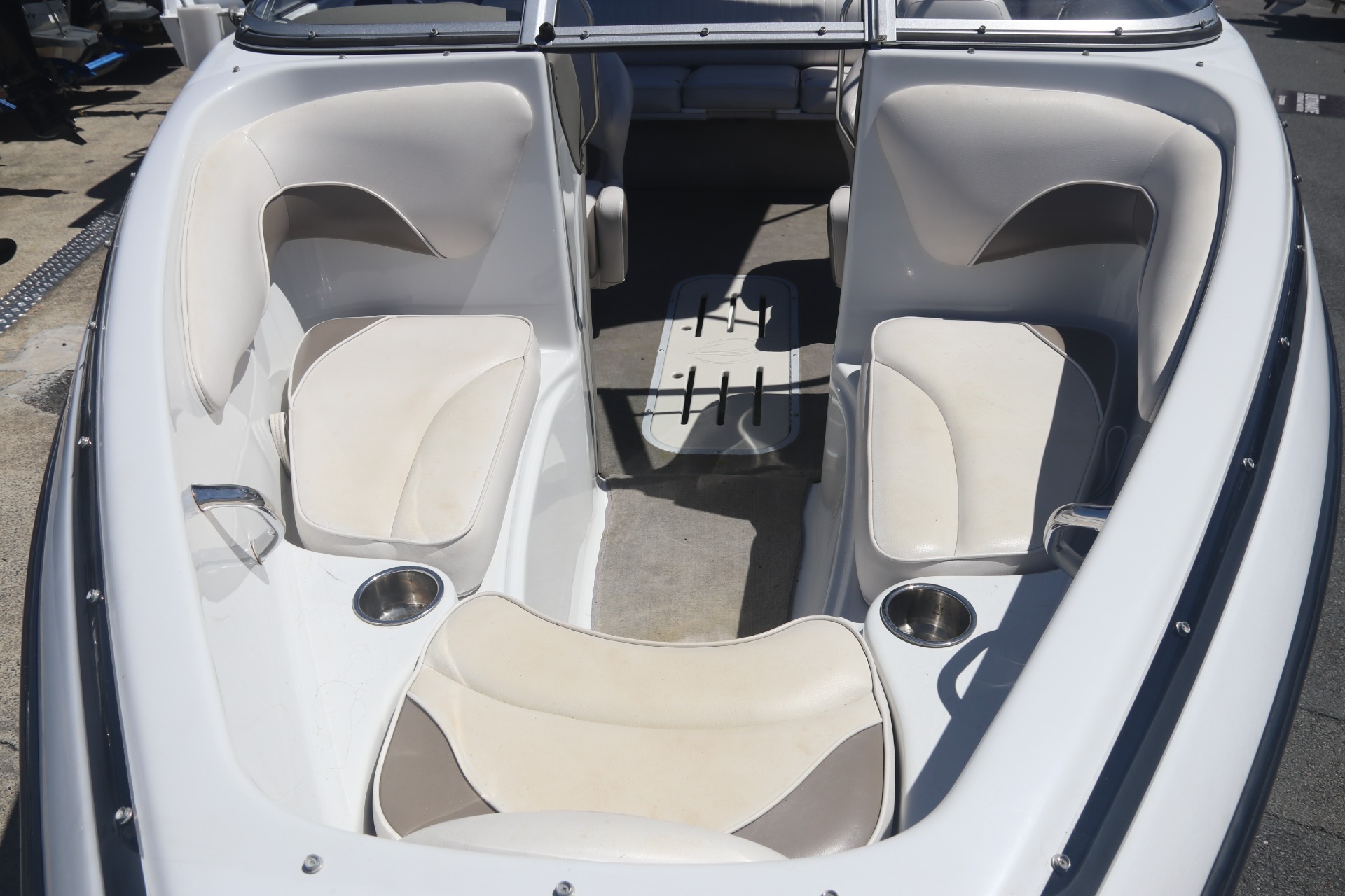 - Construction: Fiberglass bowrider with an extended fiberglass swim platform.
